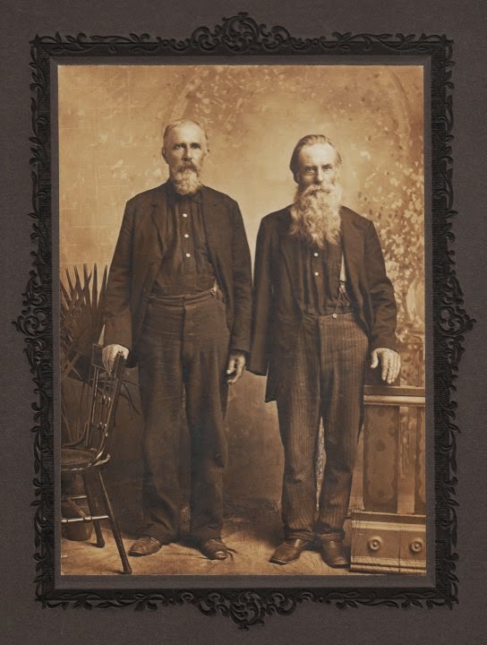 One of the men in the picture, looked exactly like one of the Shepard pictures I had scanned a few years ago and uploaded to Flickr. Not similar, exactly. So a read of the caption told me that this was a picture of brothers Charles and Kinzey Smith, both veterans of the Civil War. Charles had fought for the Union side, Kinzey joined the Confederates.