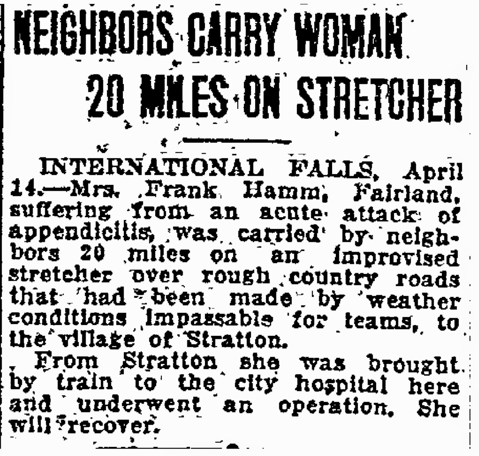 My great grandfather, Fred Hamm, had many wives and relationships, in fact I am sure there are some we know nothing about. His second and third wives were both named Emma, although he didn’t marry his third wife until many years after they had been living together. He divorced his second wife in 1918, so the article below could be about his second wife Emma Steinbach Fischer, or his third girlfriend/wife Emma Paugel Hamm. They were all still in International Falls, Minnesota at the time this incident occurred.