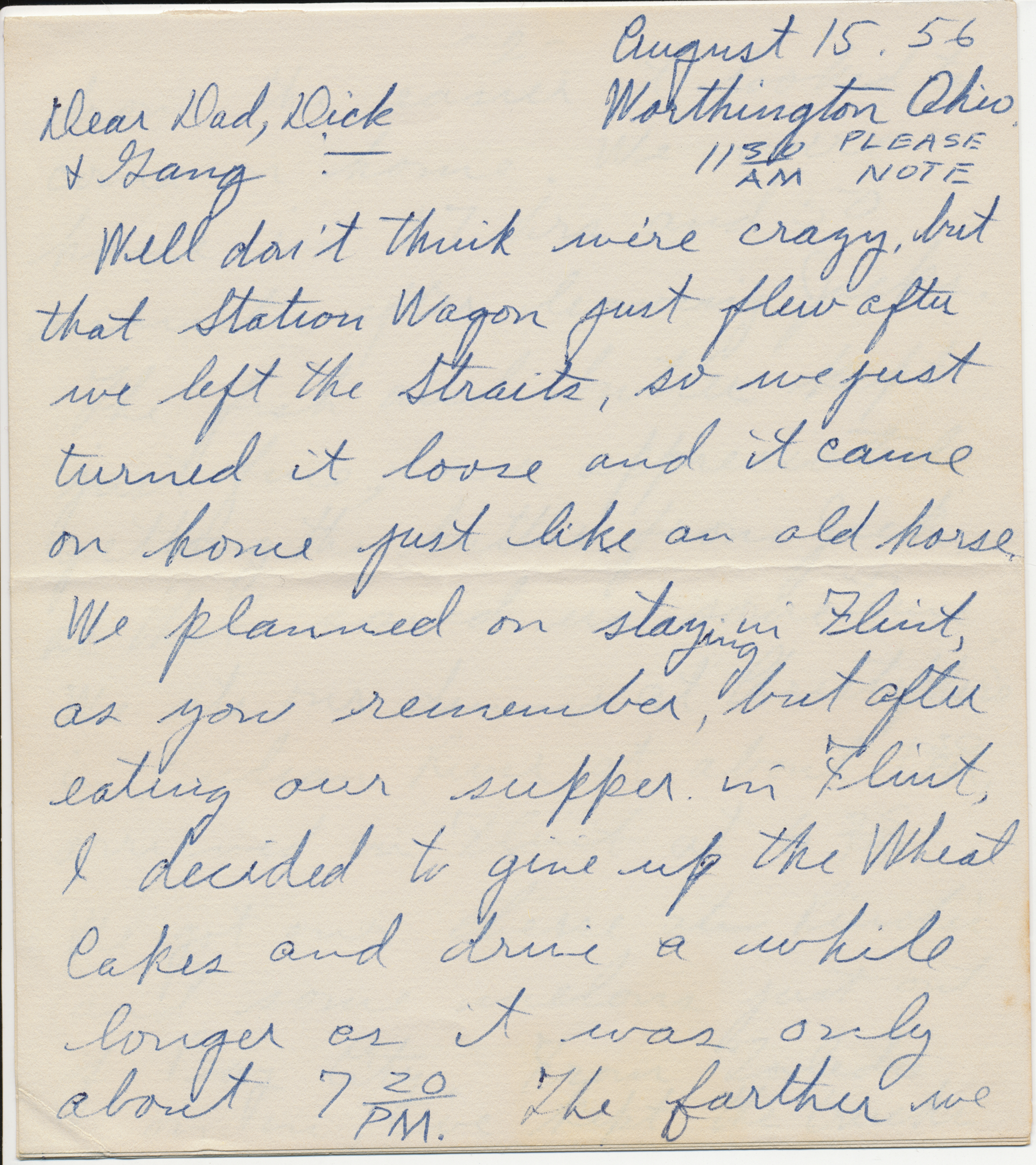 Well don’t think we’re crazy, but that Station Wagon just flew after we left the Straits, so we just turned it loose and it came on home just like an old horse. We planned on staying in Flint, as you remember, but after eating our supper in Flint, I decided to give up the wheat cakes and drive a while longer as it was only about 7:20PM. The farther we