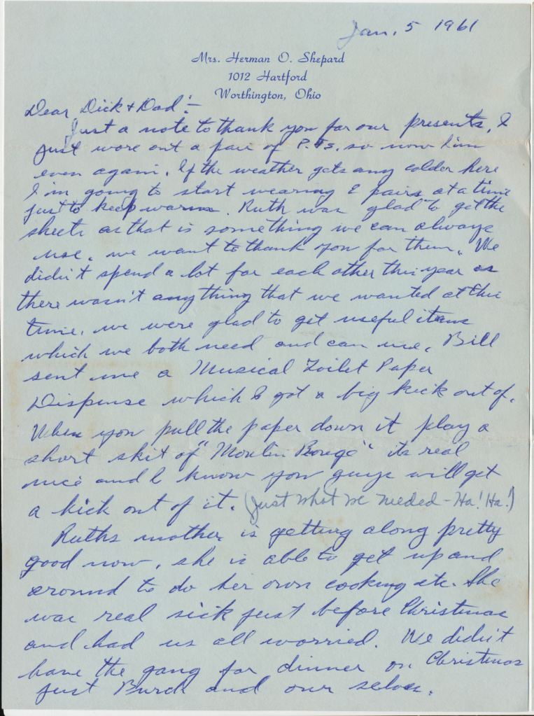 Just a note to thank you for our presents. I just wore out a pair of P.J.s so now I’m even again. If the weather gets any colder here I’m going to start wearing 2 pairs at a time just to keep warm. Ruth was glad to get the sheets as that is something we can always use. We want to thank you for them. We didn’t spend a lot for each other this year as there wasn’t anything that we wanted at this time. we were glad to get useful items which we both need and can use. Bill sent me a musical toilet paper dispense which I got a big kick out of. When yo pull the paper down it play a short skit of “Moulin Rouge” its real nice and I know you guys will get a kick out of it. (Just what we needed-Ha! Ha!@) [in his wife Ruth’s handwriting]