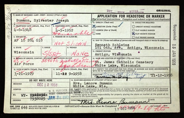 Sylvester Bumann is my deceased father-in-law. He passed away at the relatively young age of 29 in 1958. Because he was in the Air Force for 4 years he was eligible for a military headstone. Here is the application that was filled out to acquire one: