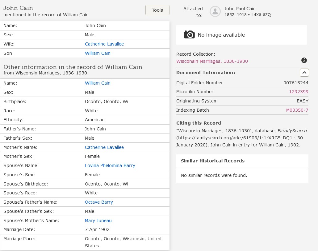 I had to read this document over several times before I was sure it was the same William Cain, because some interesting information shows up in his marriage record. Such as, his mother is named as Catherine Lavallee. If the clerk filled out the form, then Catherine could have been misheard for Carrie, or the record was transcribed incorrectly into the index. But, even more interesting is the reference of his mother’s surname as Lavallee. This was his grandmother Jennie’s surname at the time she died in the 1870s. And Carrie and her sister Ida were Rosas not Lavelleys. So I can only imagine what stories Carrie was telling her children, or how even she didn’t really know what was true. There was already the story being told, and passed down by her children, that Carrie’s father had died during the Civil War. We know that was not true, and it was her mother who probably told her girls this when they moved to Wisconsin, without their father.