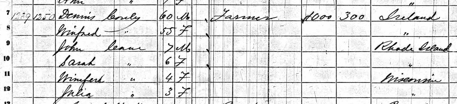 Living with them are 4 of their grandchildren: John, Sarah, Winifred and Julia Cane. Winifred and Julia had been born in Wisconsin. Dennis and Anne were still in Rhode Island with their parents. So the question is why were their grandchildren living with them? I can understand why two of them were born in Wisconsin, their daughter Winifred probably travelled out to Wisconsin to have her children with the help of her mother.