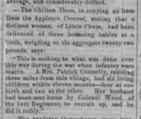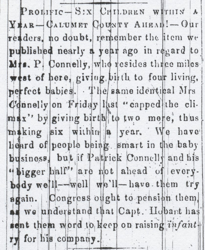 Patrick and his wife Elizabeth Connelly lived in Chilton, Wisconsin after emigrating from Ireland in the late 1840s. Well, Patrick most likely did, I don’t know anything about Elizabeth, (although I think I read somewhere that they married before emigrating, don’t quote me on that, and it is not really relevant to the story).