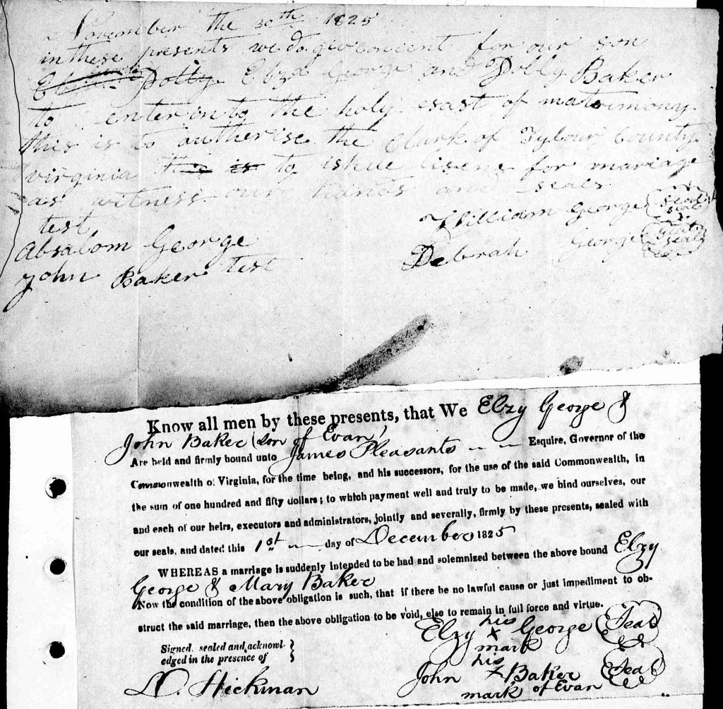 Elzy George and Polly/Mary Baker marriage bonds, November 30, 1825 and December 1, 1825. Tyler County, [West] Virginia. Test. Absalom George and John Baker, son of Evan, William George and Deborah George.