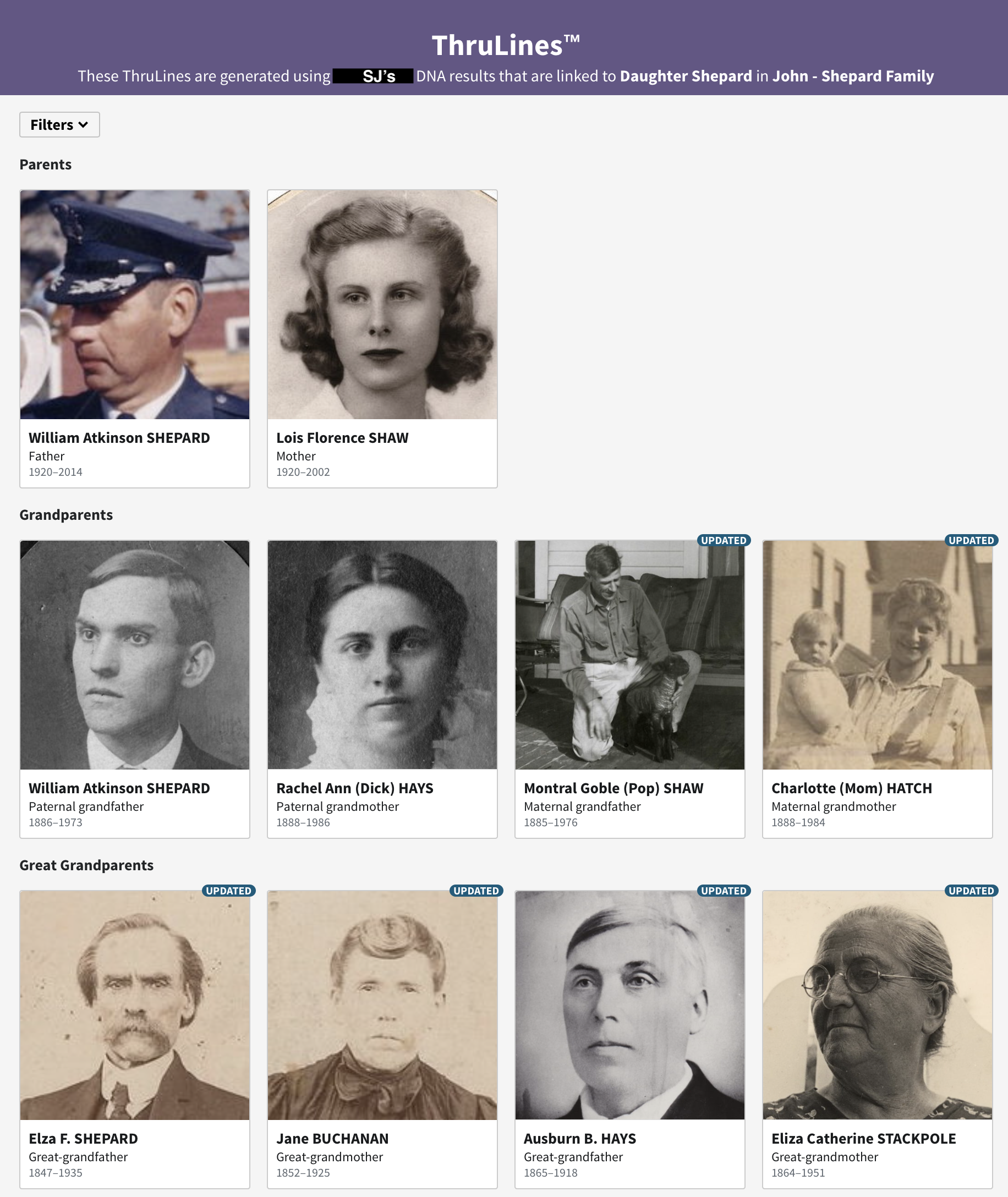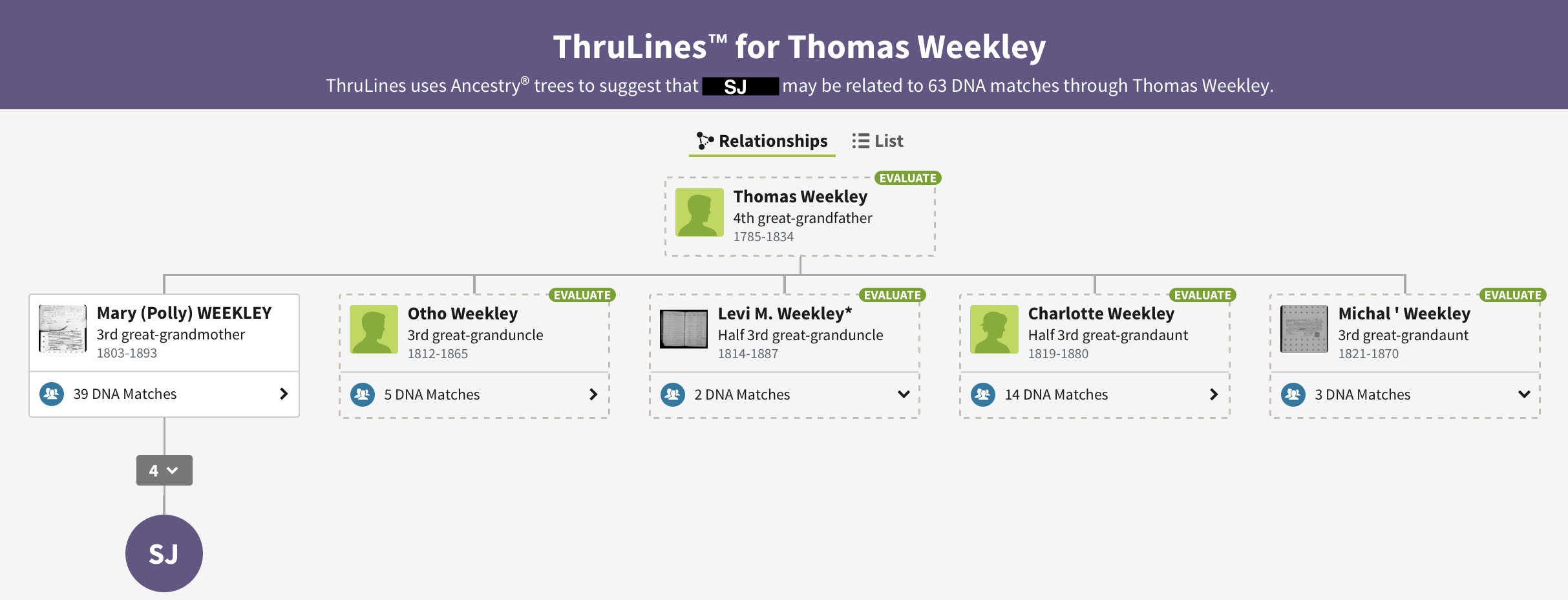 ThruLines as defined by Ancestry.com: ThruLines uses Ancestry trees to suggest how SJ may be related to their DNA matches through common ancestors.