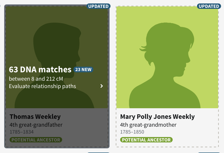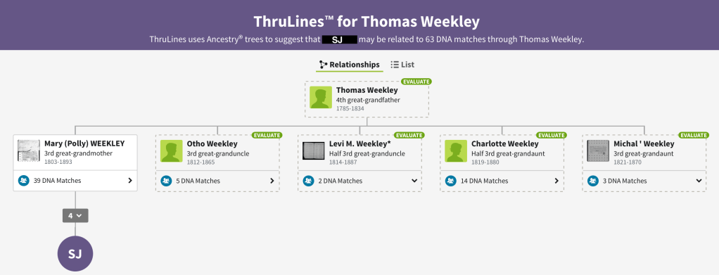 Now this match does not mean that Mary is a daughter of Thomas, it is merely being suggested because we match all these other Weekleys who appear to be children of Thomas. The DNA only tells us that we match these Weekleys, not HOW we match them. ThruLines are suggestions, that could be correct. It is also possible that Thomas had a sibling who is Mary’s parent.