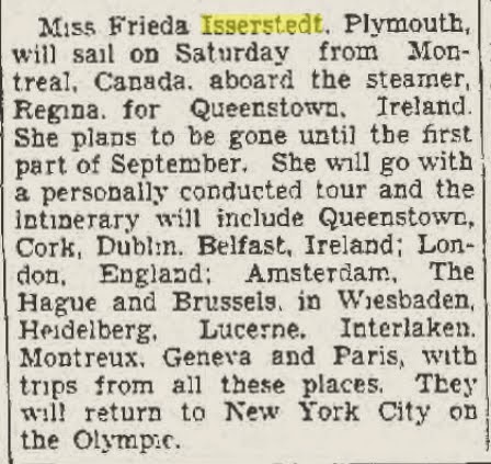 Frieda Isserstedt is my 1st cousin 3 times removed. Or to be less confusing, she is the daughter of my gg grandmother Amelia Isserstedt Hamm’s brother, Fritz. I hope that helps. She was a graduate of the University of Chicago and was a teacher. From all accounts a very much respected one too. According to her students no one could stump her on a historical event date.