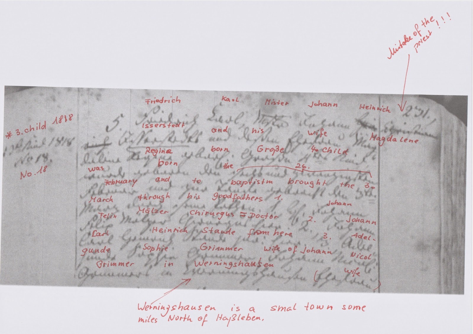 5. Friedrich Karl, Mister Johann Heinrich Isserstedt and his wife Magdalene Regina (born Grosse) 4th child, was born the 26th of February [1822] and baptized the 3rd of March through his godfathers 1. Johann Felix Mälzer Chirurgus = doctor 2. Adelgunde Sophie Grimmer wife of Johann Nicol Grimmer in Werningshausen [is a small town some miles north of Hassleben].