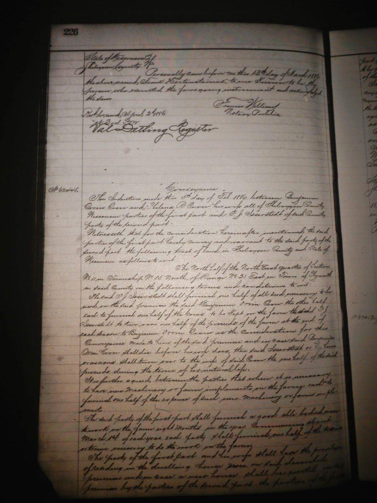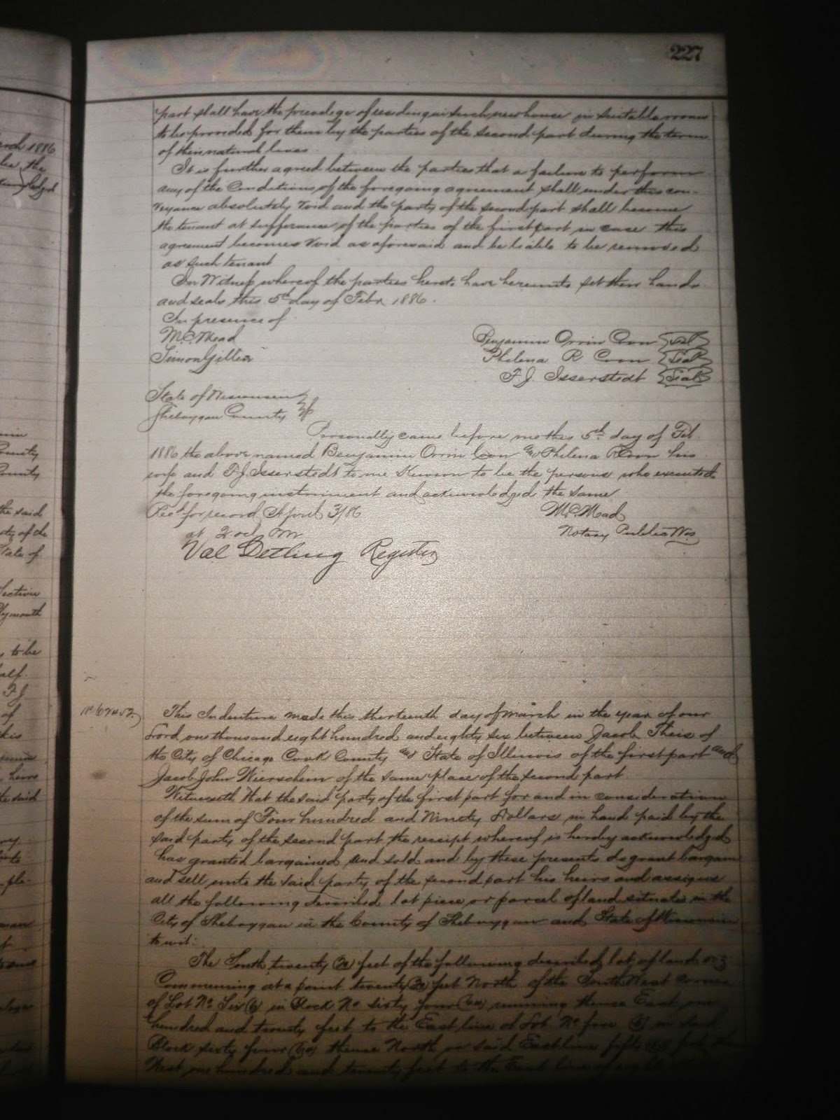 This indenture made this 5th day of Feb. 1886 between Benjamin Orrin Coon and Philena R. Coon his wife all of Sheboygan County Wisconsin parties of the first part and F. J. Isserstedt of said County party of the second part.