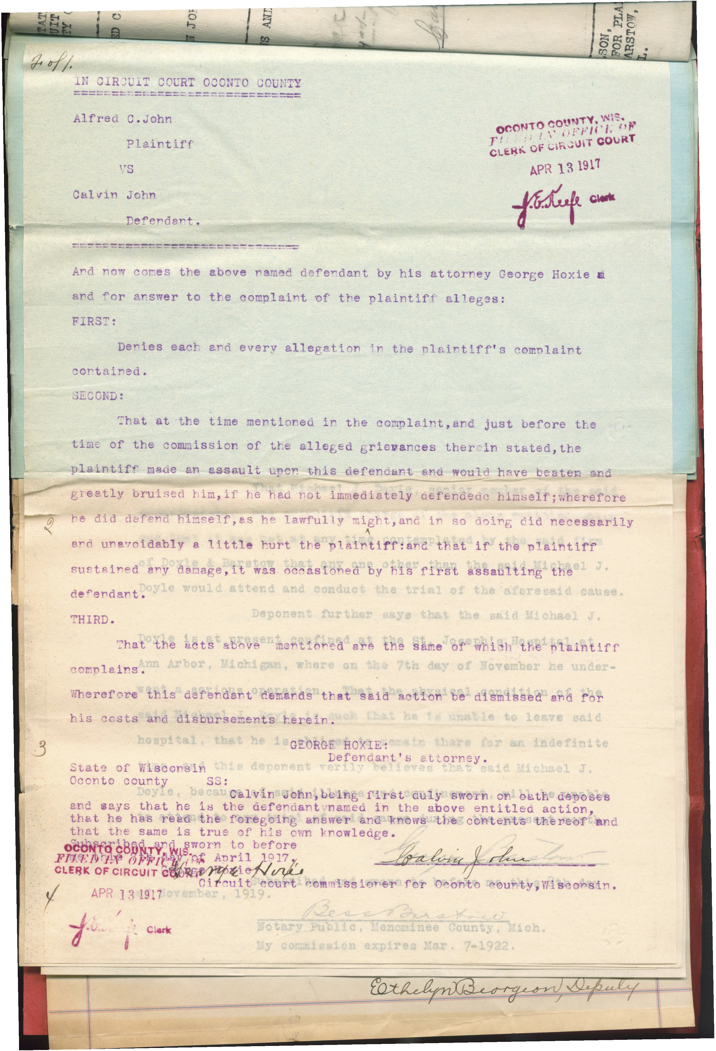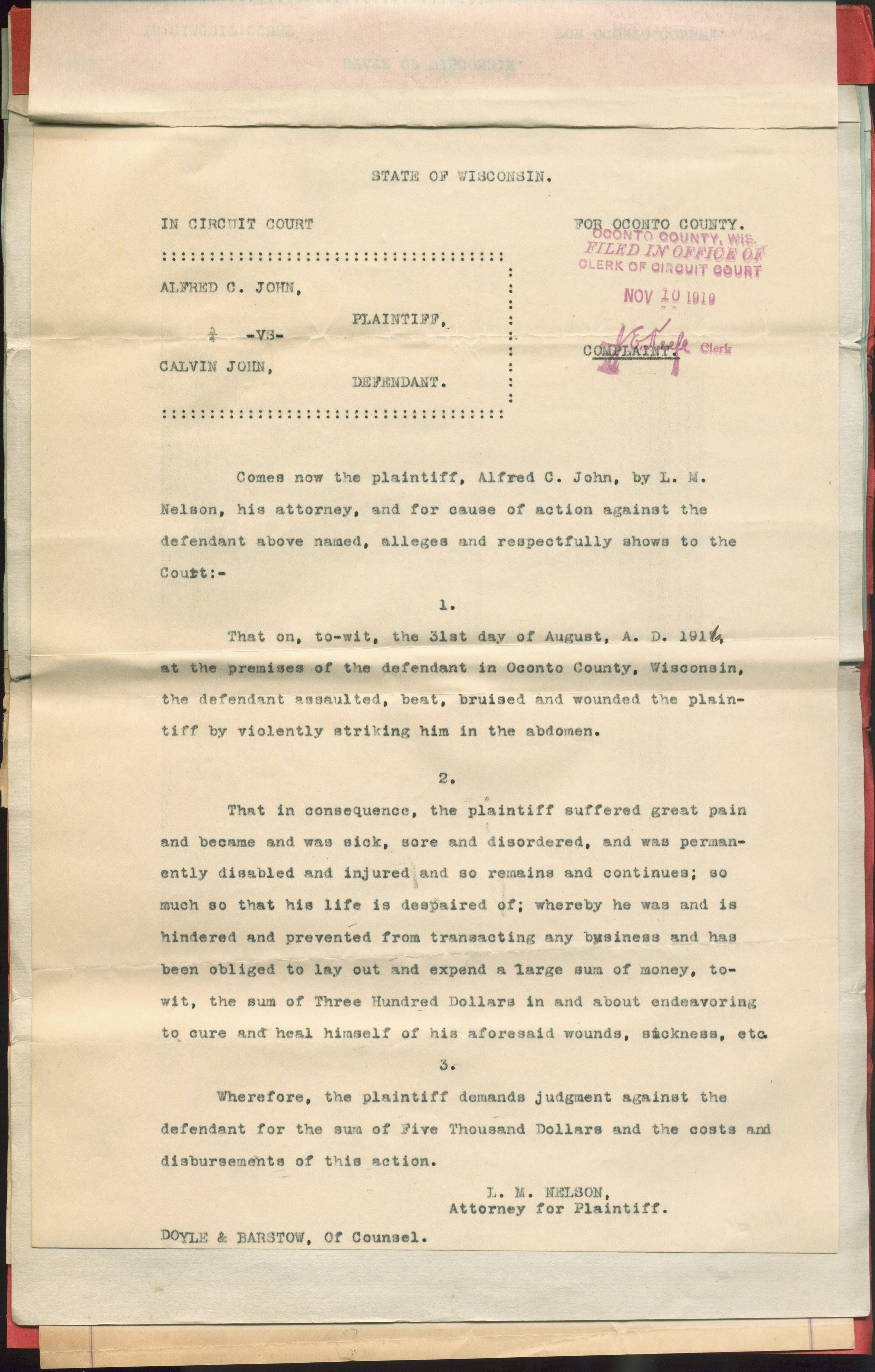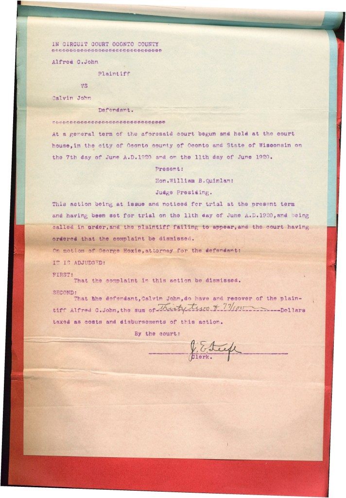 In my court records research regarding the John family in Oconto County, Wisconsin, I found an interesting case. It was Alfred C. John (my gg Uncle) vs. Calvin John (my 1st cousin, 2x removed).