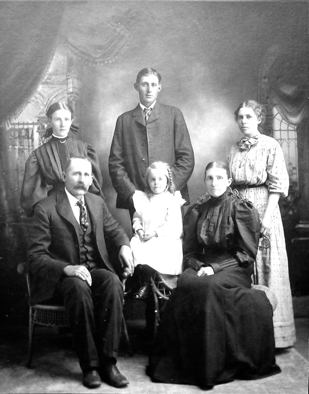 Abt. 1904: Eva, Calvin, Hattie, Alfred, Mildred, and Harriet John family photo.