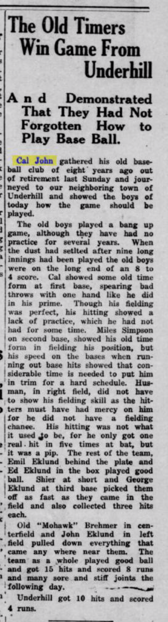 Calvin worked in lumber camps his whole life, running, owning, or laboring at them. But Cal wasn’t all work, he could be found in the local paper often as part of the local baseball team, or other types of play.