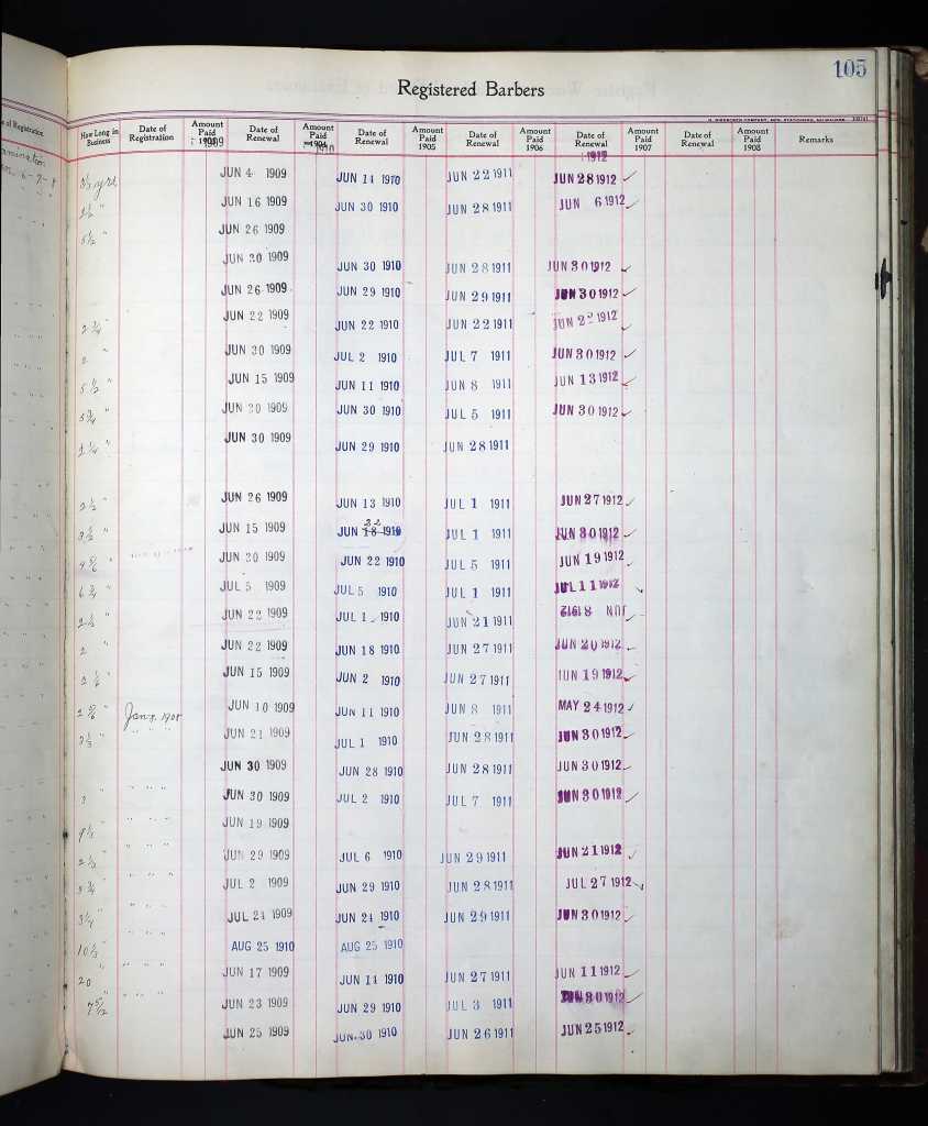 Barber register, 1903-1913; Wisconsin. Barbers Examining Board; Series 880, box 1 flat, Wisconsin Historical Society, Madison Wisconsin. [Ancestry.com. Wisconsin, Employment Records, 1903-1988 [database on-line]. Lehi, UT, USA: Ancestry.com Operations, Inc., 2018. digital image 638-639 of 770]