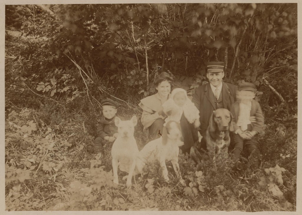 Gertrude’s family: husband Vic, and three boys. It looks like each boy had his own dog. This was taken in Wabeno area most likely.