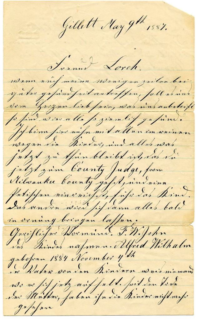 Gillett May 9, 1887 Friend Lorig, If this letter will reach you in good health we will be very grateful. As far as we are concerned everyone is fine. I have taken care of everything here as far as the children are concerned and what remains to be done is for you to go to the County Judge in Milwaukee and submit a petition for the child and everything will take care if itself. Legal guardian F. W. John the child’s name Alfred Wilhelm born on November 4, 1884. We do not know where the father of the children now resides. Since their mother died the children have not seen him. The mother died October 4 1885. The children are all in my care in the Town of Gillett in Oconto County. I am telling you that so you might be able to answer questions they might put to you. Greeting from all of us to all who ask how we are and write when everything is taken care of. Your friend F. W. John