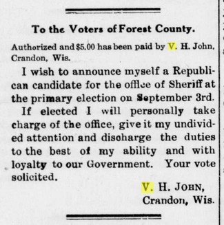 This is Victor’s notice posted in the Wabeno Northern Advertiser addressed to the citizens of Forest County, Wisconsin that he was running for sheriff. Now, things were not going to be easy for him in this election, two other men were also running. All of them were from Crandon.