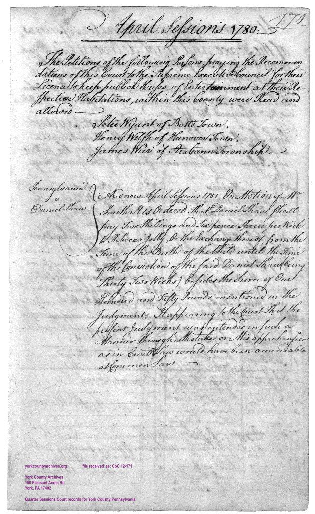 Now that last one is kind of a trick question. You see, I found a very interesting court record when I was going through the York County Archives on line. This record is about a Daniel Shaw who impregnated Rebecca Jolly, and was in court being fined and convicted for the crime of bastardy in 1780 (or ’81 the record has both dates).
