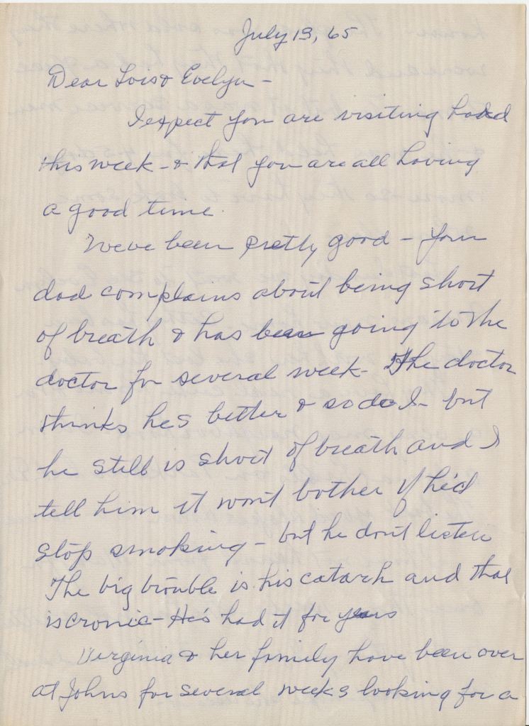We’ve been pretty good — your dad complains about being short of breath & had been going to the doctor for several week. The doctor thinks hes better & so do I. But he still is short of breath and I tell him it won’t bother if he’d stop smoking- but he don’t listen The big trouble is his catarrh and that is cronic – He’s had it for years