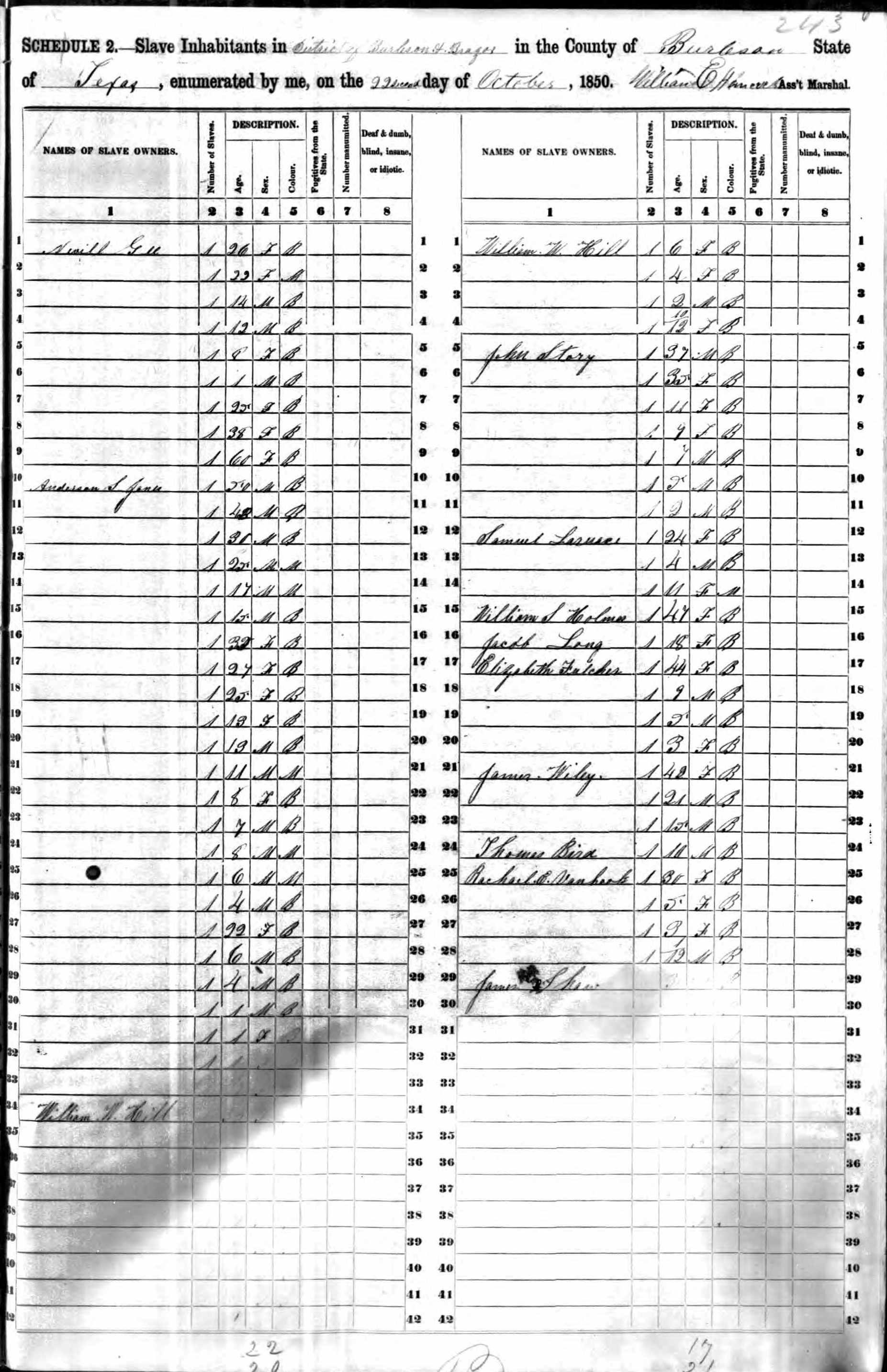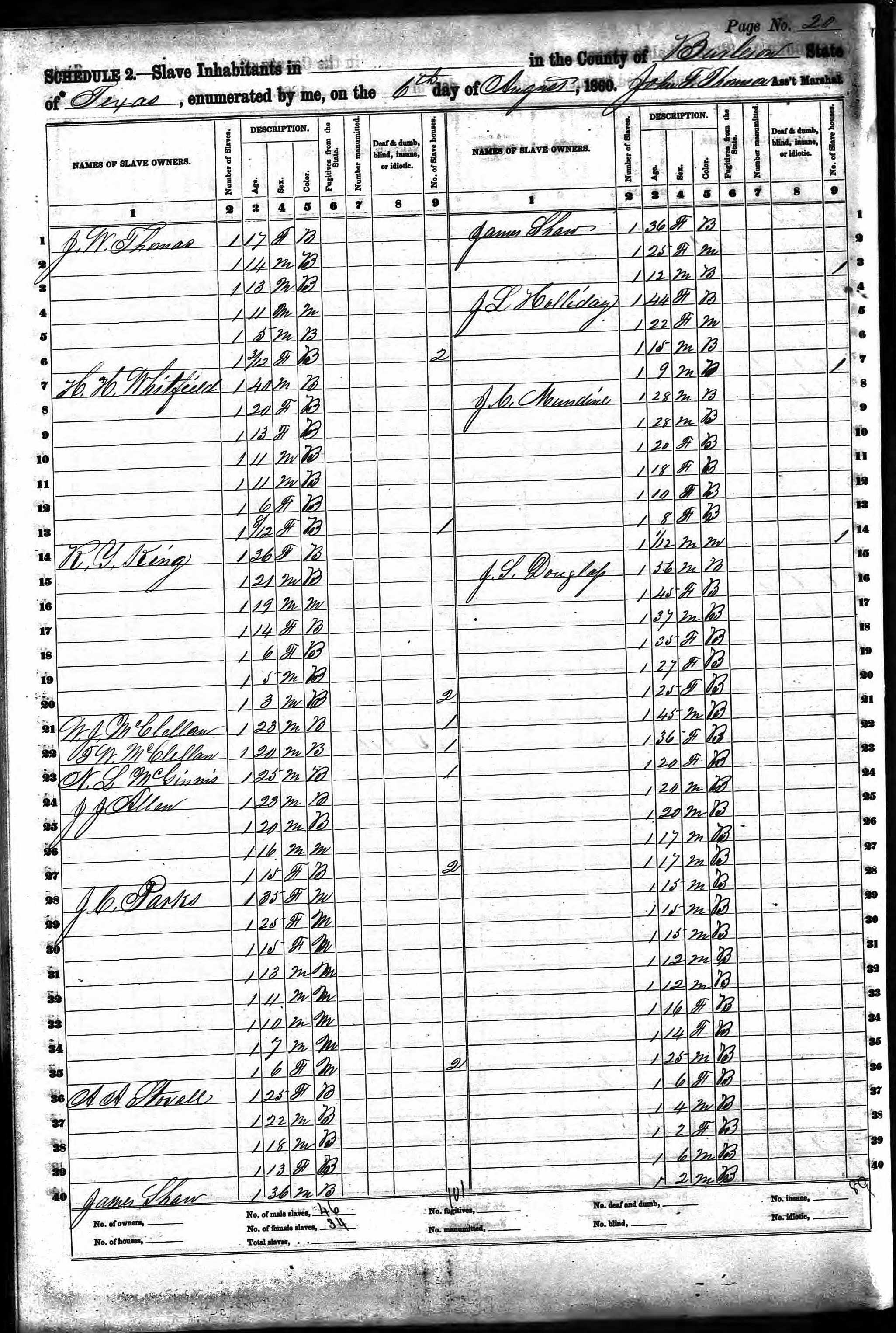 Here he is in the 1860 Texas Slave Schedule. He owns 4 slaves: 2 males 1-36 years old and 1-12 years old 2 females 1-36 years old and 1-25 years old (she is Mulatto) 1 slave house.