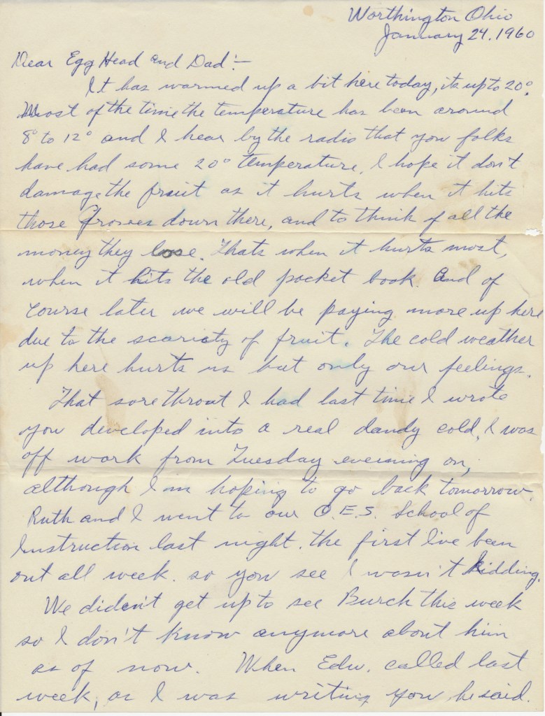 It has warmed up a bit here today, it’s up to 20°. Most of the time the temperature has been around have had some 20° temperature. I hope it don’t damaged the fruit as it hurts when it hits those groves down there, and to think of all the money they lose. That’s when it hurts most, when it hits the old pocketbook. And of course later we will be paying more up here due to the scarcity of fruit. The cold weather up here hurts us but only our feelings.