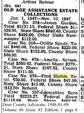 Fred Hamm, my great grandfather, died in Door County in 1951. According to his obituary he is buried in a cemetery at Bailey’s Harbor. (Hubby and I went to find his burial plot a few years back, but no luck finding a headstone in the cemetery for him; had a great brunch in town though.)