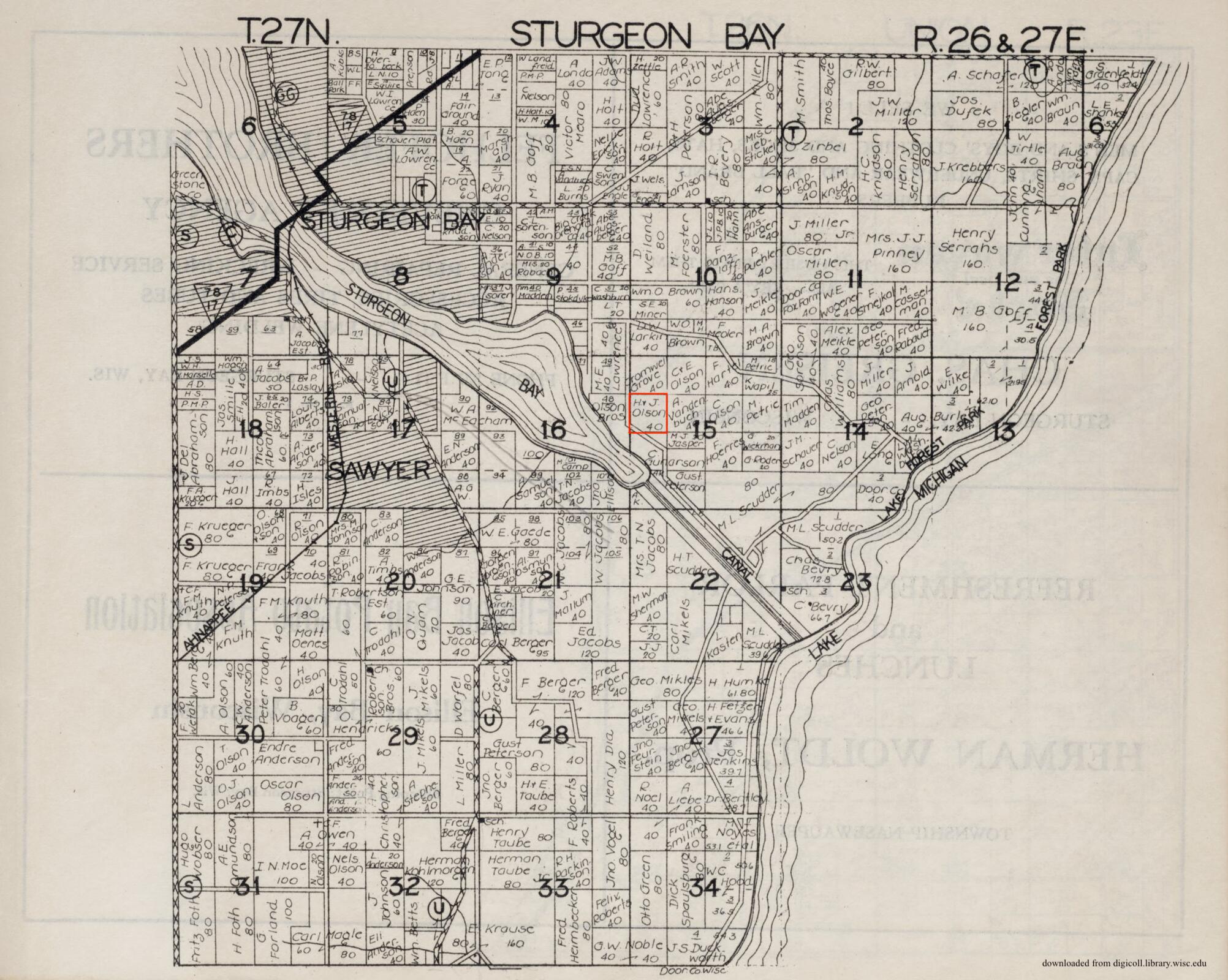 Of course now I was curious as to where exactly this property was located in Door County. So I did a little digging. (Sometimes it is very hard to find plat maps online.) The property is described as being: SW 1/4 NW 1/4 S15 T27 R26