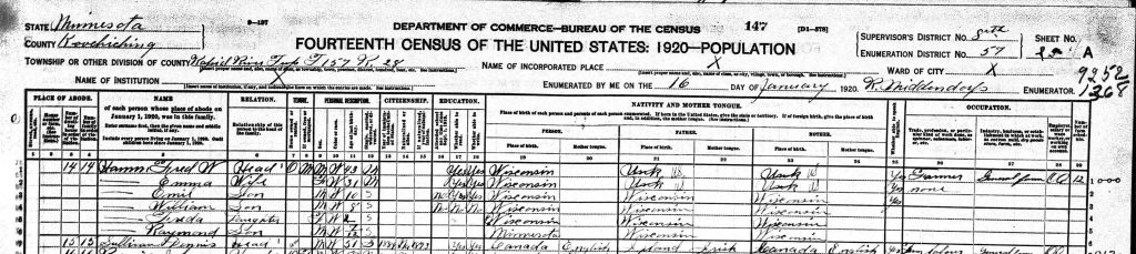There was a US agricultural census made in 1920, and Fred was on it, but unfortunately it was destroyed by the US Government, who saw no reason to keep it. Only a few states survived the destruction, Minnesota was not one of them. So that means we have no idea what Fred and Emma were growing and farming on their property during the 8-10 years that they lived there.