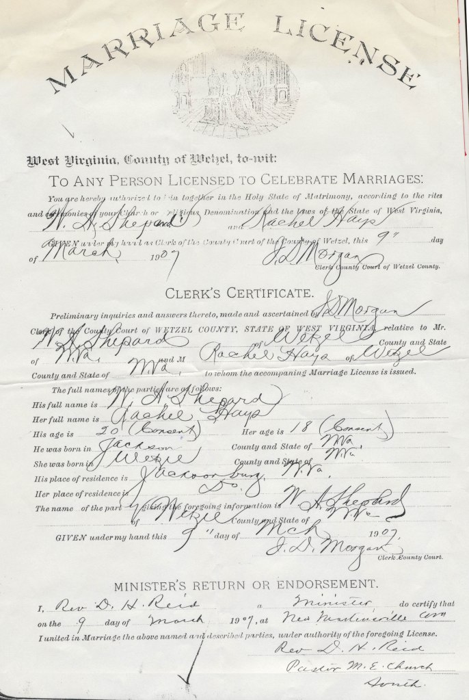 Of course over time, as is wont, she got older. Then along comes William Atkinson Shepard, a newly minted teacher who recently arrived in Wetzel County, having received his teaching certificate from a Normal School, (although at this time we don’t know which one). Family rumor has it that this is how Dick and he met. It is not likely that they met because he was her teacher, because he would have been about 16 years old or younger in order for that to happen, which is doubtful. So it is possible that they met when she went to pick up some of her younger siblings from school. Maybe the locals took turns having the new teacher to dinner to get to know him, or they met at church or a local festivity. We might not know the exact how of it, but she definitely took a shine to him.