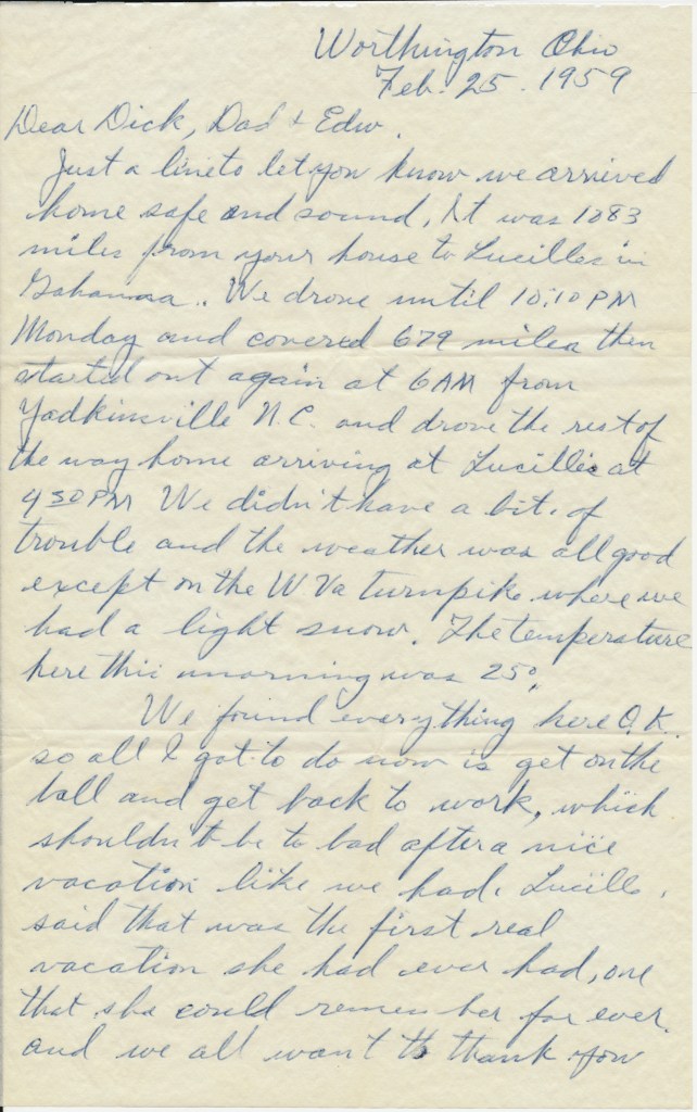 Just a line to let you know we arrived home safe and sound. It was 1083 miles from you house to Lucilles in Gahanna [Ohio]. We drove until 10:10 PM Monday and covered 679 miles then started out again at 6AM from Yadkinville N.C. and drove the rest of the way home arriving at Lucilles at 4:50 PM We didn’t have a bit of trouble and the weather was all good except on the W Va turnpike where we had a light snow. The temperature here this morning was 25 degrees.