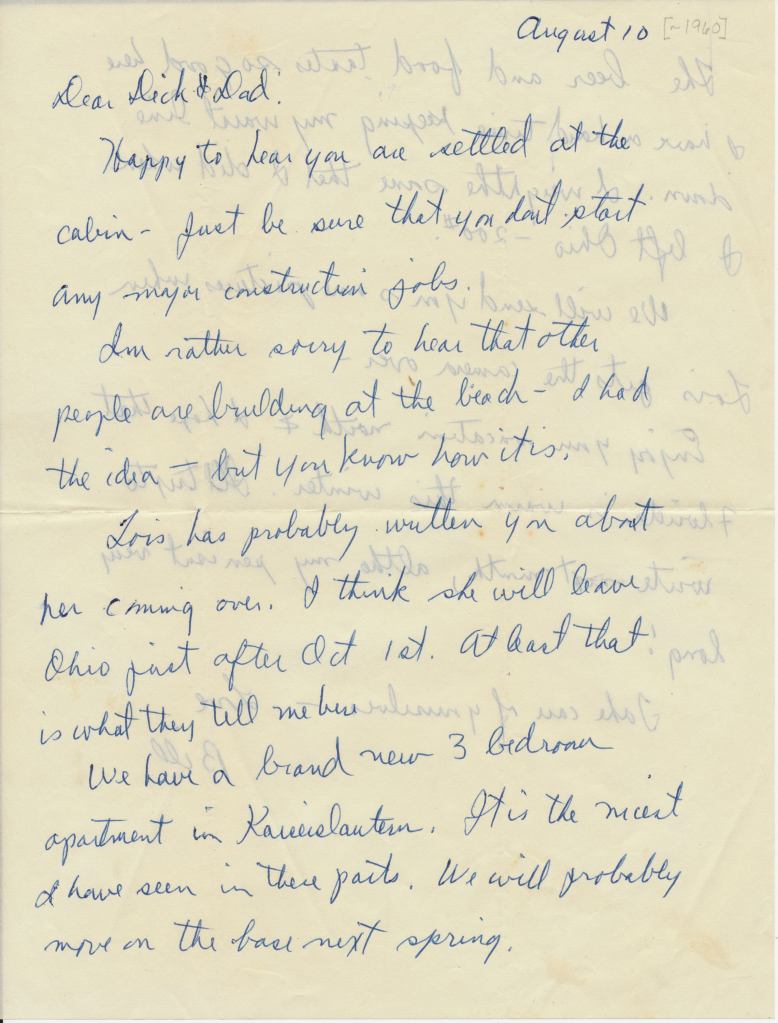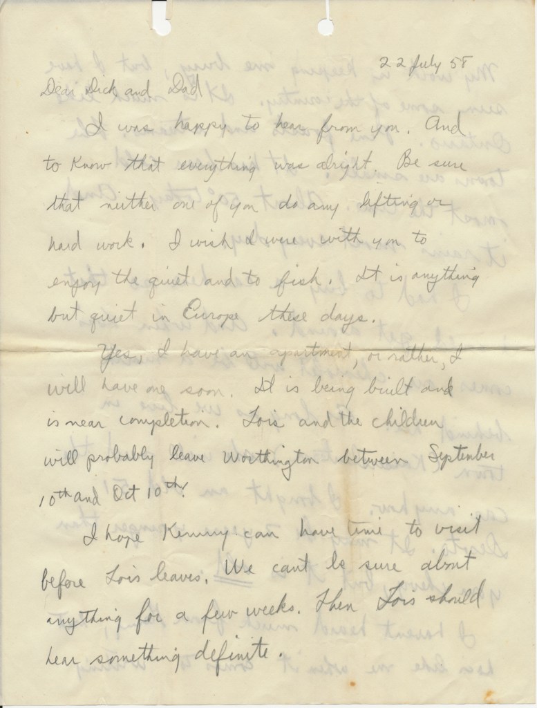 22 July 58 Dear Dick and Dad I was happy to hear from you. And to know that everything was alright. Be sure that neither one of you do any lifting or hard work. I wish I were with you to enjoy the quiet and to fish. It is anything but quiet in Europe these days.