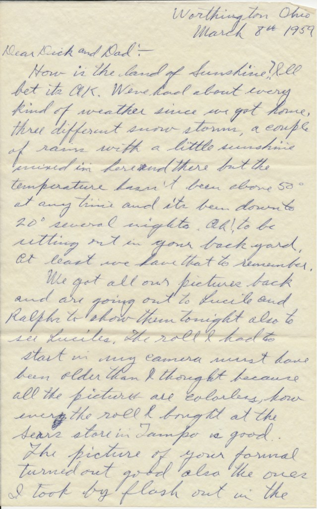 [page 3] We enjoyed visiting with Edna & Hod and I hope all of us didn’t drive you nuts. How is the front porch project progressing? I suppose its finished by now and you are using it by now. I can picture all of us sitting out there reading the Tampa Tribune, first thing every morning. Speaking of the paper all of the Columbus paper are on strike and have been since the day after we got home so the only paper we are getting is the Tribune once a week. We really miss the papers as the news you get on the radio and T.V. only hits the high spots and don’t give any of the details besides we miss the ads etc. Ruth misses the “Funnies”.