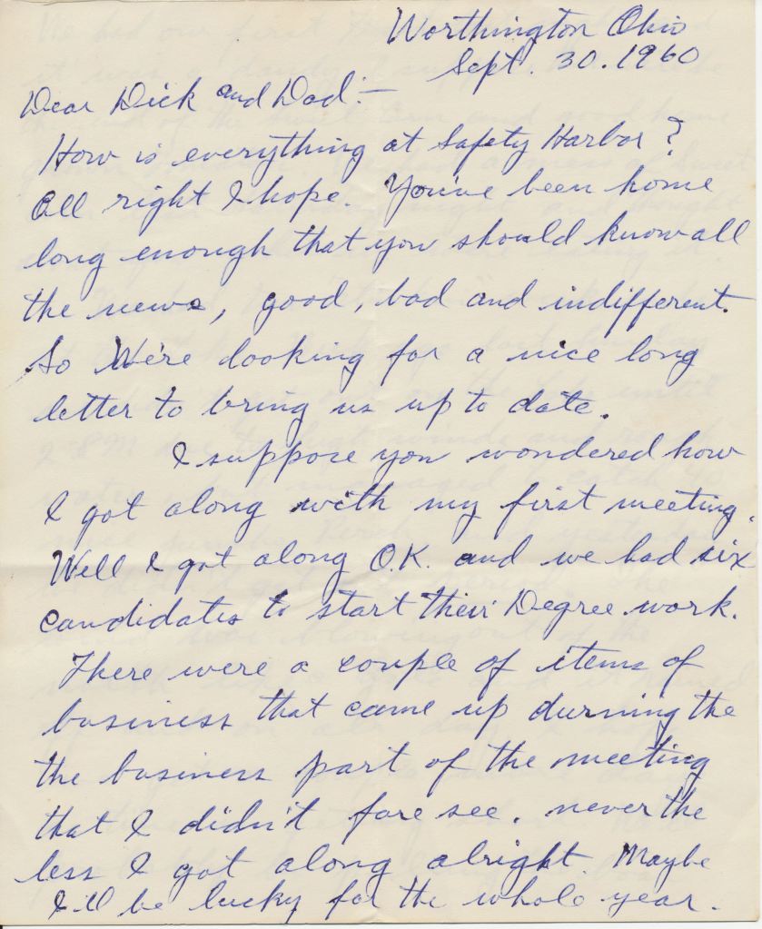 I suppose you’re wondering how I got along with my first meeting. Well I got along O.K. and we had six candidates to start their degree work. There were a couple of items of business that came up during the business part of the meeting that I didn’t foresee, nevertheless I got along all right. Maybe I’ll be lucky for the whole year.