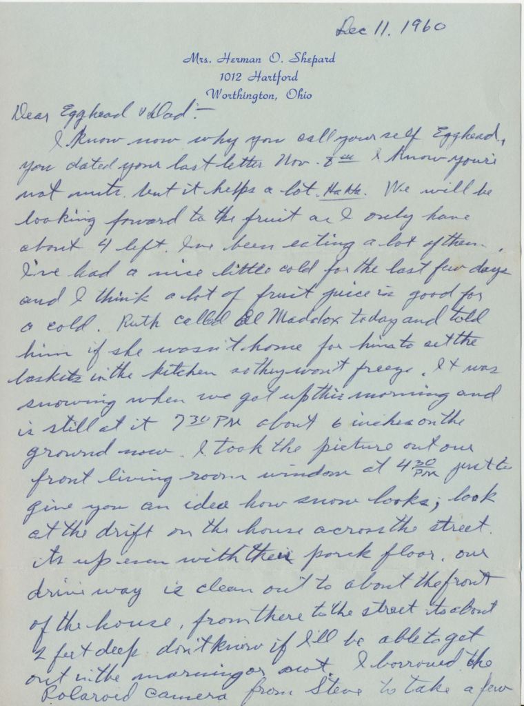 I know now why you call yourself Egghead, you dated your last letter November 8 and I know you’re not nuts, but it helps a lot ha ha. We will be looking forward to the fruit as I only have about four left. I’ve been eating a lot of them. I’ve had a nice little cold for the last few days and I think a lot of fruit juice is good for a cold. Ruth called Al Maddox today and told him if she wasn’t home for him to set the baskets in the kitchen, so they won’t freeze. It was snowing when we got up this morning and it’s still at it 7:30 PM about 6 inches on the ground now. I took the pictures out of our front living room window at 4:30 PM just to give you an idea how snow looks, look at the drift on the house across the street. It’s up even with their porch floor, our driveway is clean out to about the front of the house from there to the street it’s about 2 feet deep don’t know if I’ll be able to get it out in the morning or not. I borrowed the Polaroid camera from Steve to take a few shots to see if I would like to have one. From the results I don’t believe I’ll buy one they don’t seem to be good sharp pictures. The picture of the group although you won’t be able to tell one person from another was taken last night. Martha Star, Ruth and I had a party for our officers and their husbands. We held it at the Linworth Methodist Church. Ruth and Martha prepared all the food at our homes and then we took it over to the church and serve there. Of course I got in on the dishwashing as did Ken, Martha‘s husband. Ocea Patman and Martha’s mother did their share and as far as I know everything went off well. Our officers presented Martha with a solid brass tray about 14 to 15 inches in diameter and me a metal tray with mahogany finish trimmed with chrome I don’t know what I’ll use it for unless I get a job in a restaurant serving tables.