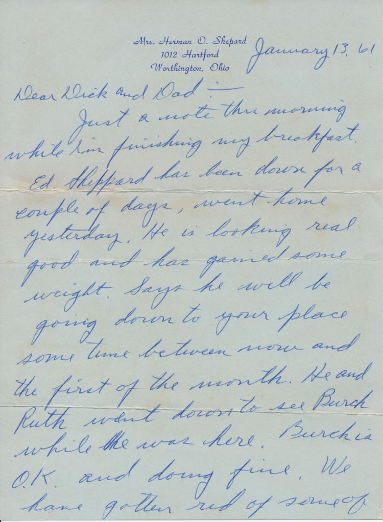 Just a note this morning while I’m finishing my breakfast. Ed Sheppard has been down for a couple of days, went home yesterday. He is looking real good and has gained some weight. Says he will be going down to your place some time between now and the first of the month. He and Ruth went down to see Burch while he was here. Burch is O.K. and doing fine. We have gotten rid of some of